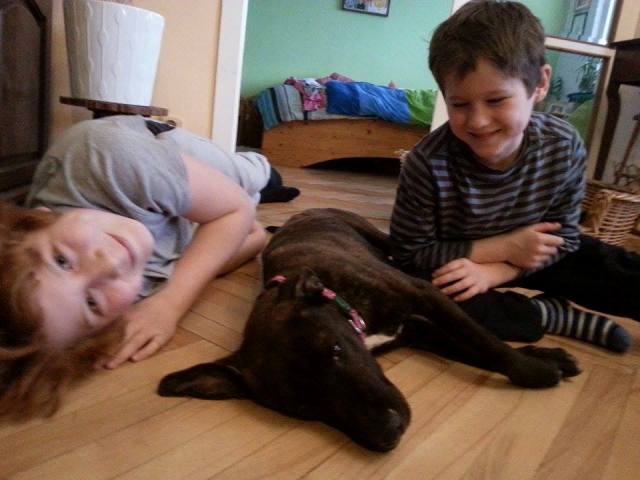 její majitelé se o ní nedokázali postarat a tak hubená fenečka našla úžasný domov s dětskými parťáky.